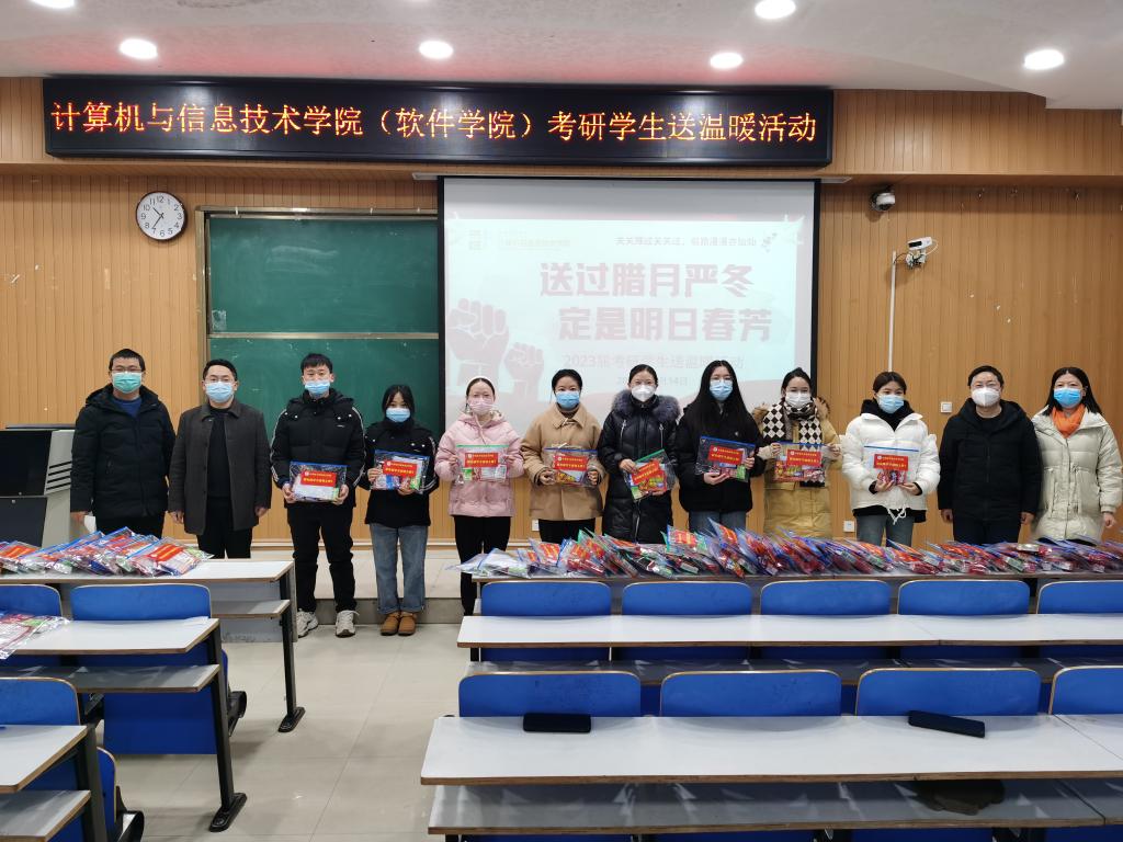 “考研送温暖,研途有温情”“送过腊月严冬,定是明日春芳”,在计科楼考研专用自习室与教室内,一条条标语寄托深情,一句句话语温暖人心。学院党委书记熊炎、院长冯岩分别带队来到考研学子当中,悉心询问同学们的课程复习情况、生活饮食近况、心理心情状态等,同学们一一回答,信心满满。随后,领导老师为同学们送上学院精心准备的考研福袋,预祝大家都能取得理想的成绩。熊炎勉励大家要坚定信心、沉着冷静、保持耐心,不到最后一刻绝不放松,在考试中充分发挥自己的实力和水平。冯岩鼓励同学们,要把握最后阶段的冲刺机会,放平心态迎难而上,一定要有信心,相信自己的多年所学与扎实复习一定会收获相应的回报。