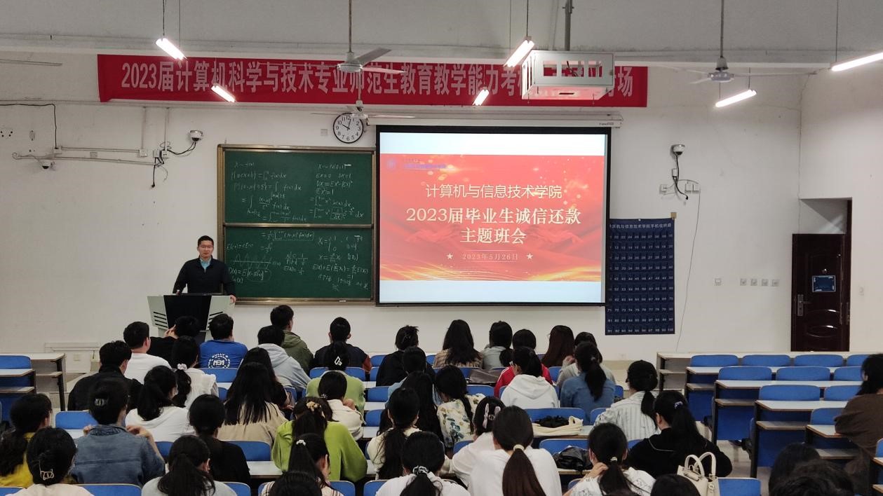 为提升大学生思想道德修养,进一步增强皇冠集团网站,crown体育官网入口2023届毕业生的诚信意识和感恩意识,引导学生树立诚信自我、感恩社会的价值观念,5月30日,皇冠集团网站在计科楼106教室召开毕业生诚信还款主题班会,由学院分团委书记徐崇茗主讲,2023届部分毕业生参与了本次会议。
