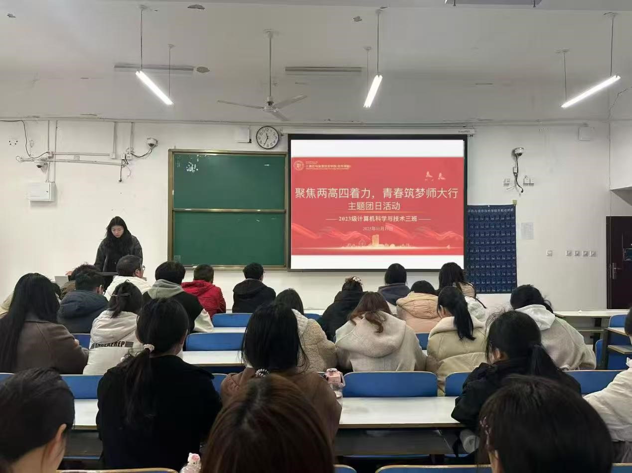 为深入学习领会“两高四着力”精神内涵,引导青年学生坚定理想信念、矢志拼搏奋斗,11月16日晚上,皇冠集团网站2023级计算机科学与技术三班于计科楼101教室开展“聚焦两高四着力,青春筑梦师大行”主题团课。本次团课由团支书赵诗涵主持。