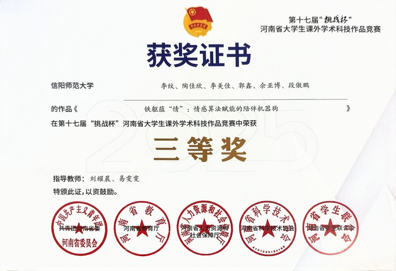 近日,由共青团河南省委、河南省教育厅等单位联合主办的第十七届“挑战杯”河南省大学生课外学术科技作品竞赛中,皇冠集团网站参赛团队凭借扎实的技术创新与实践应用能力,在全省千余项作品中脱颖而出,荣获省级一等奖1项、三等奖2项,以优异成绩充分彰显学院学科建设与人才培养的显著成效。