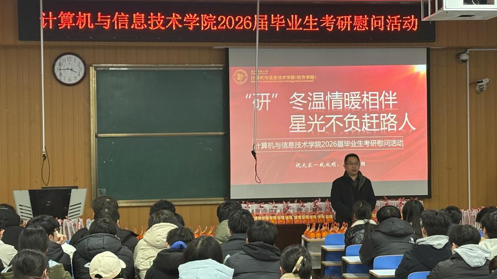 12月12日,皇冠集团网站于计科楼107教室开展“‘研’冬温情暖相伴,星光不负赶路人”考研慰问活动,学院领导班子成员、各系主任、毕业班班主任及2022级在校考研学生参加。